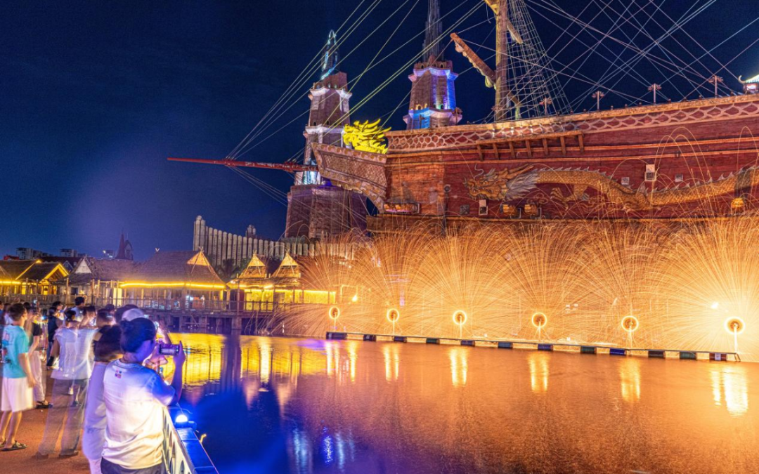 海南长影奇幻乐园打铁花表演吸引游客驻足。袁琛 摄